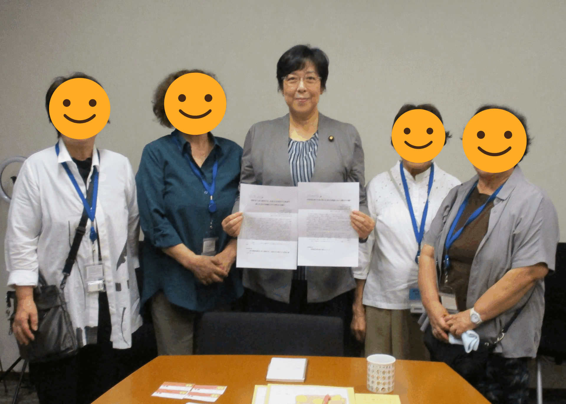 田名部議員のもとへは、同じ地元の八戸民商婦人部から参加している4名に青森県で集まった『56条廃止を求める署名』255筆と『傷病手当・出産手当確立を求める署名』155筆を預け、田名部議との面談へ。同じ八戸出身ということで、率直に業者婦人尾置かれている状況を説明し、「56条廃止」の国会での早期採択を直接訴え要請しました。田名部議員は以前にも署名を受け取ってくれたこともあり、「業者婦人の働き分がいまだに認められていないのはおかしい。頑張ってみます。」と、快く署名を受け取ってくれました。その4後万円の定額減税や法人税の事、スポーツなどの雑談も含め、時間の許す限り楽しく面談できました。他8名の議員は残念ながら国会開催期間ではないため、海外出張などで不在ということで今回お会いすることはかないませんでした。しかし8名ともそれぞれの議員秘書が対応してくれたため、議員のもとへ私たちの訴えが届きますよう願いを込めて『所得税法第56条の廃止を求める請願』と『国保への傷病手当・出産手当制度の確立を求める請願』に賛同対する賛同のお願いと、名刺をそれぞれの議員秘書へ預けてきました。