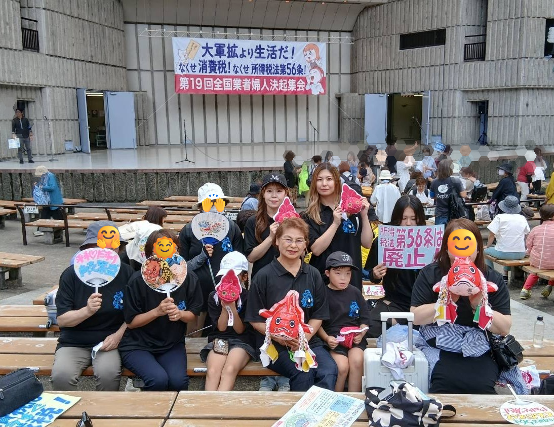 オープニングでは9つの県婦協がステージの上でお揃いのチームウェアを身にまとい会場を賑やかに盛り立て、決起集会がスタート。エール交換では、決起集会の司会を務めた青森県婦協会長のIさんの{青森県のみなさ~ん!」という呼び掛けに、持ち寄ったねぶたのうちわや、金魚ねぶたを高くかざし会場へ元気にアピールしました。続いて全婦協の塚田豊子会長から「6年ぶりのリアル開催になった。業者婦人を取り巻く厳しい状況が続く中、全国の元気な仲間と会えて嬉しい。消費税減税・インボイス廃止・所得税法56条廃止など、私たちの要求を実現させるまで声を上げ、仲間と一緒に頑張ろう」と、主催者挨拶として会場へ呼び掛けました。