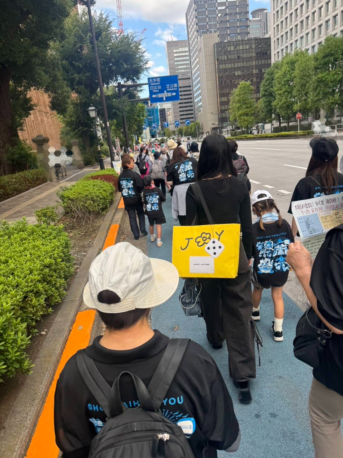 閉会後は、4つのグループに分かれ銀座方面をデモ行進。業者婦人の熱い思いをアピールしました。行進する距離が長い中、Iさんと事務局のTさんのお子さんたちは終始元気にプラカードを掲げて可愛く沿道へアピール。年配の参加者もそれぞれのペースを保ちながら、青森県代表の参加者みんなでデモ行進を無事に歩き切りました。